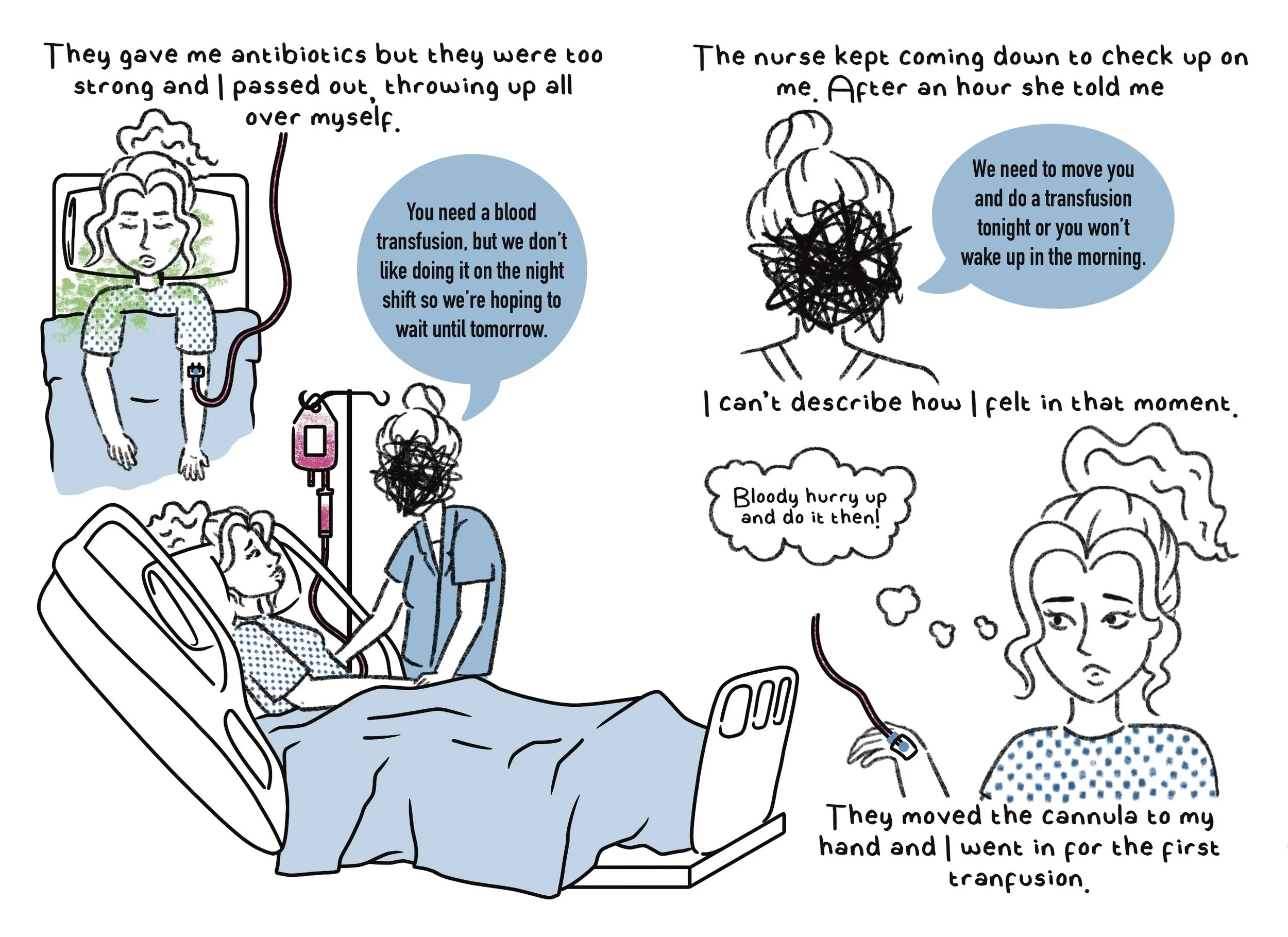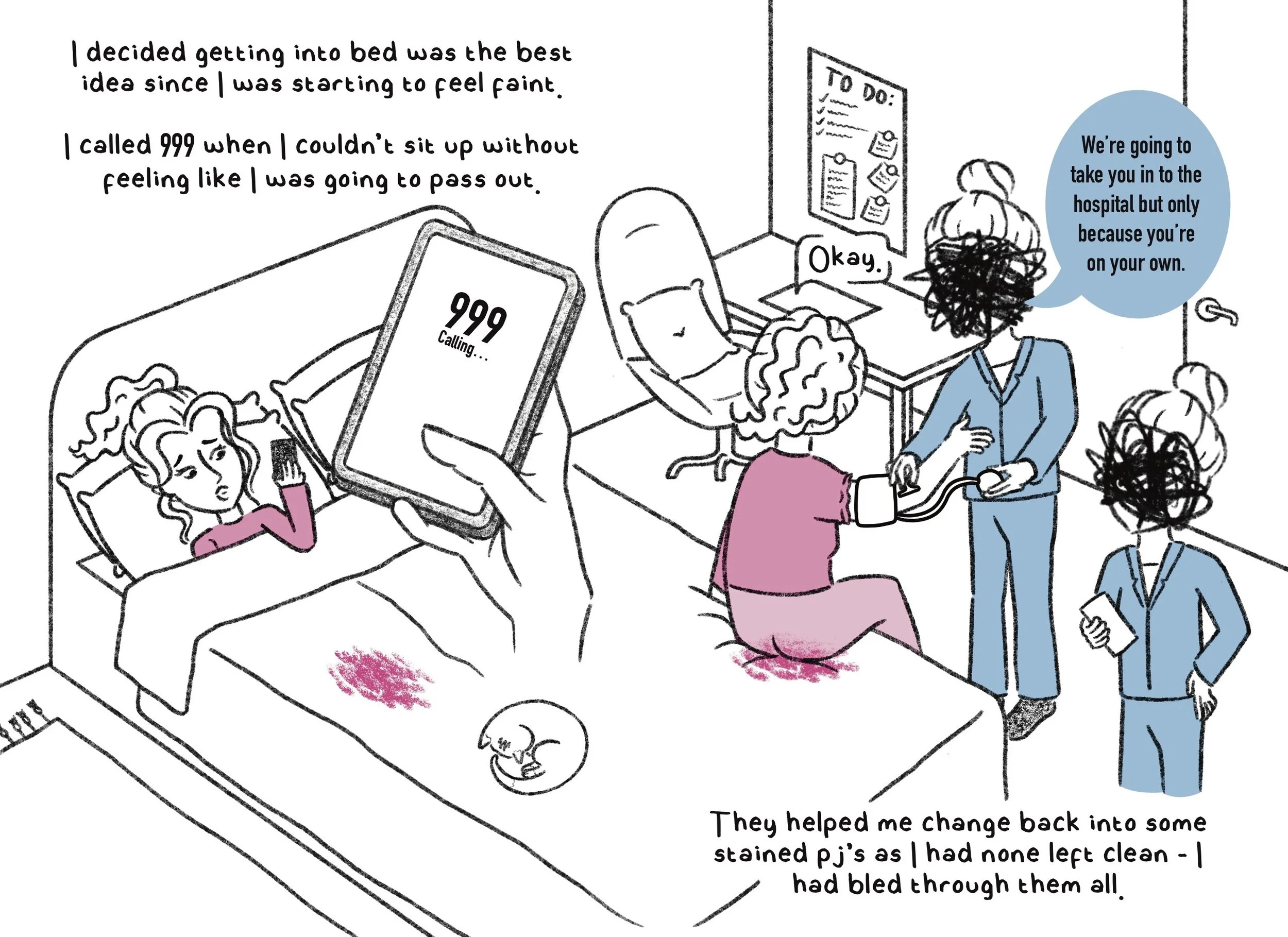 Content Warning - The following set of panel narratives deals with themes of emotional turmoil, abortion healthcare and blood.